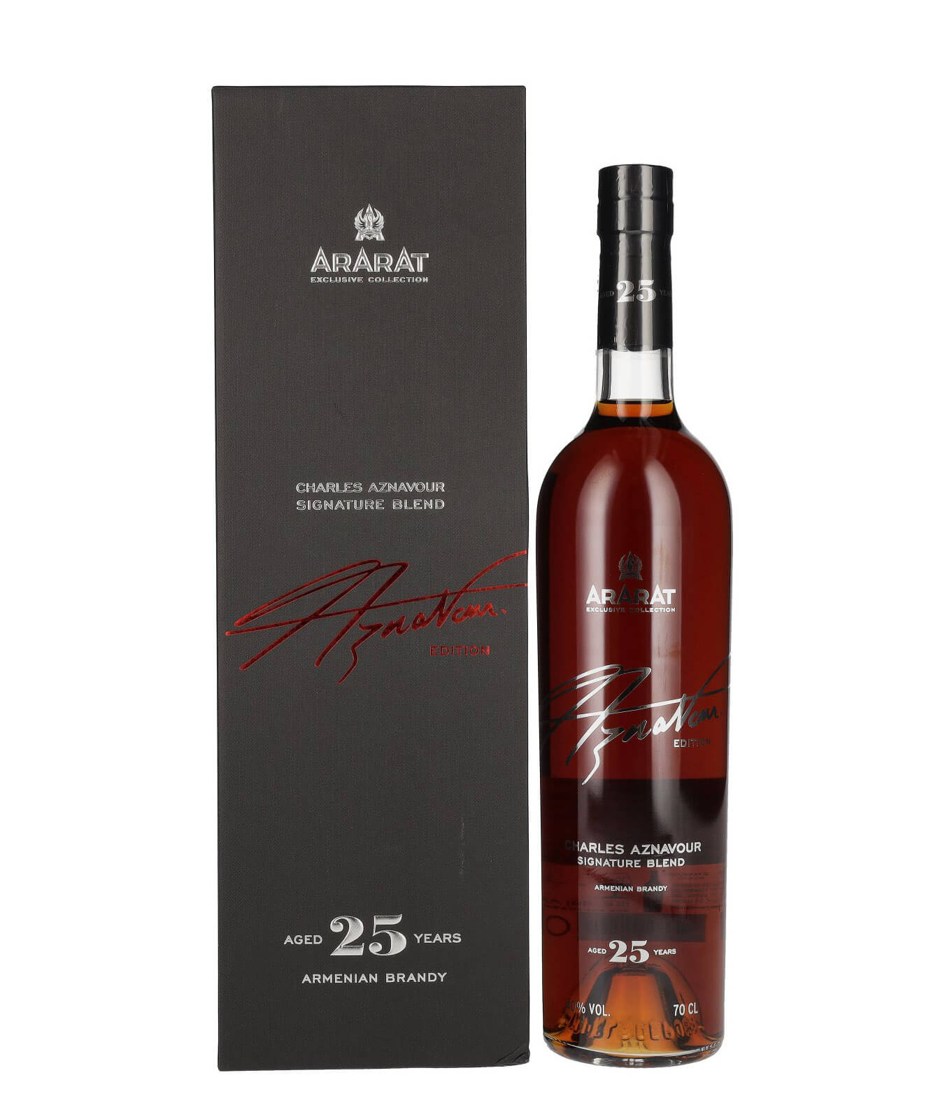 Ararat Charles Aznavour Signature Blend je zmes špeciálnych a vzácnych vínnych destilátov. Charles Aznavour sa zúčastnil degustácie a vybral tak vínne destiláty do kupáže, z ktorých každý odráža moment v jeho celoživotnej práci. Súčasťou tohto brandy sú vínne destiláty z rokov 1956, 1960 a 1981. Je stará 25 rokov.
