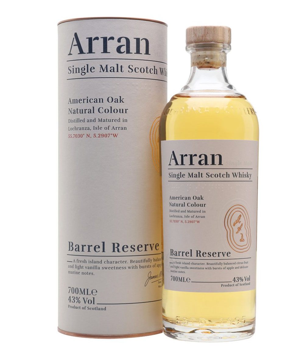 Fľašovaná pri 43 %, čo zdôrazňuje lahodné, sladké ovocné tóny, ktoré sú charakteristickým znakom destilačného zariadenia Arran. Fantastický objav! Úplne nová Barrel Reserve je svieža, ľahká a štýlová Single Malt a Single Barrel Scotch Whisky. Zreje v 100% bourbonových sudoch. Bez ohľadu na príležitosť, táto vynikajúca whisky bude určite vaša obľúbená. Ochutená, čistá, s ľadom, alebo v long drinku či kokteile, stane sa vašim vyhľadávaným nápojom. Na zdravie!