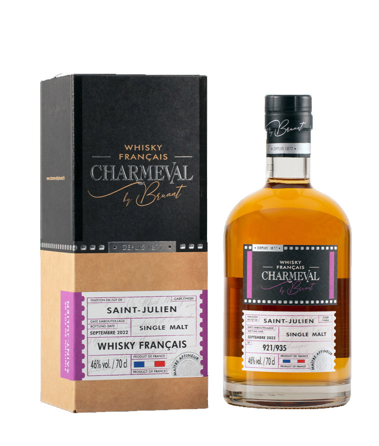 Po troch výnimočných finišoch Bruant teraz predstavuje svoje dve nové francúzske whisky. Charmeval Saint Julien je single malt whisky vyrobená zo zmesi najlepšieho jačmeňa, ktorý sa zbieral, skladoval, destiloval a dozrieval vo výnimočných sudoch. Táto whisky najprv zreje v dubových sudoch, potom niekoľko mesiacov dozrieva v sudoch Saint Julien.