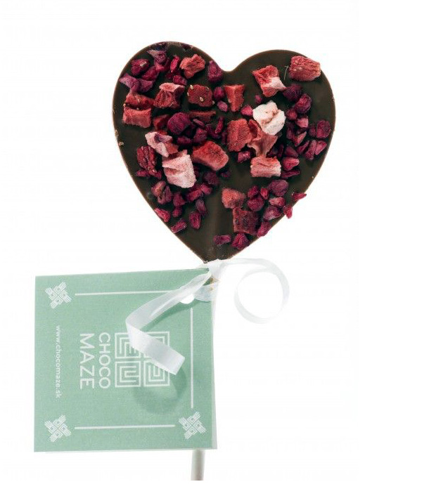 Toto lahodné lízatko obsahuje mliečnu čokoládu s obsahom 33,6 % (zloženie: cukor, kakaová hmota, sušené plnotučné mlieko, kakaové maslo, emulgátor sojový lecitín a prírodná bourbon vanilka) a kúsky jahôd a malín.