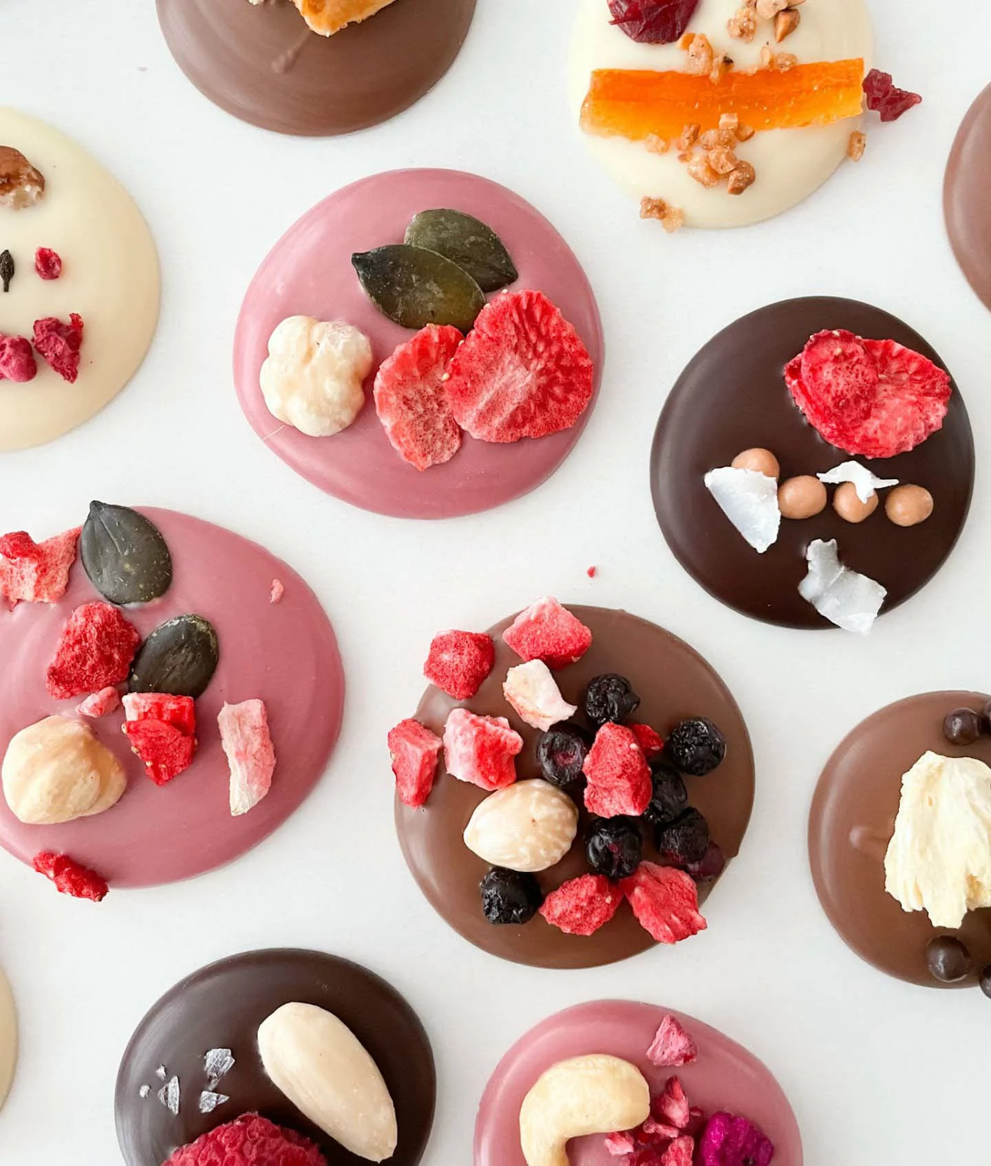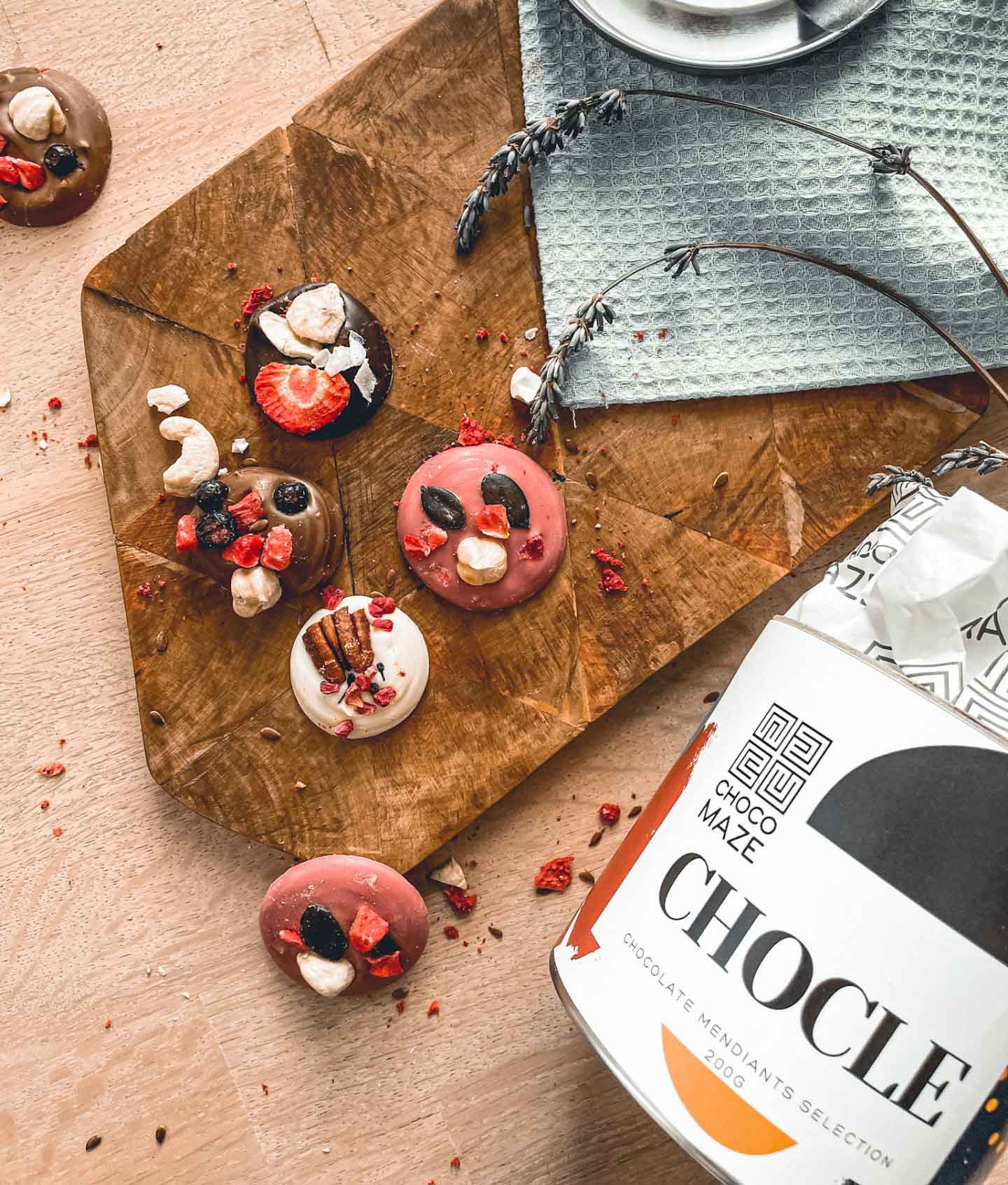 V balení Chocomaze mendianty nájdete 4 rôzne druhy čokolády v 8 príchutiach: 60,1 % horkej čokolády, 33,6 % mliečnej čokolády, 28 % bielej čokolády, 47 % rubínovej čokolády a jahody, maliny, kešu, čerešne, ananás a iné ovocie.