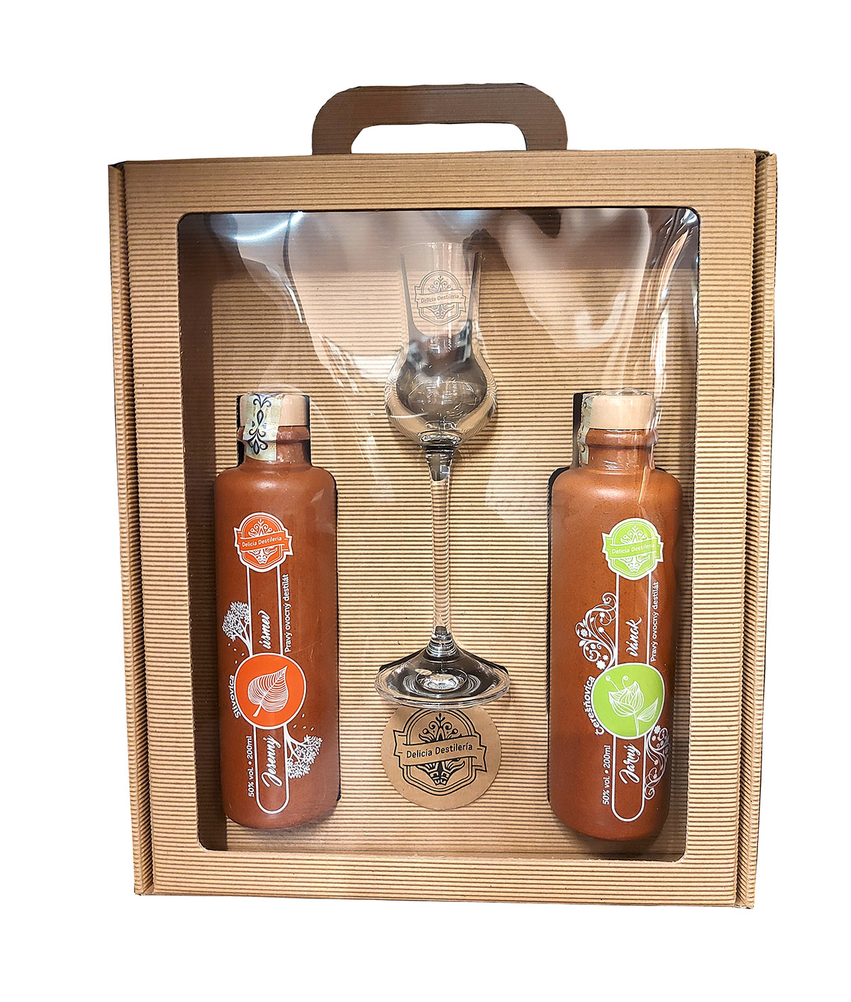 Darčeková kazeta obsahuje jednu fľašu s objemom 200 ml slivkového destilátu s obsahom alkoholu 50% a jeden čerešňový destilát s objemom 200 ml a obsahom alkoholu 50%. Súčasťou balenia je aj degustačný pohár na nápoje.
