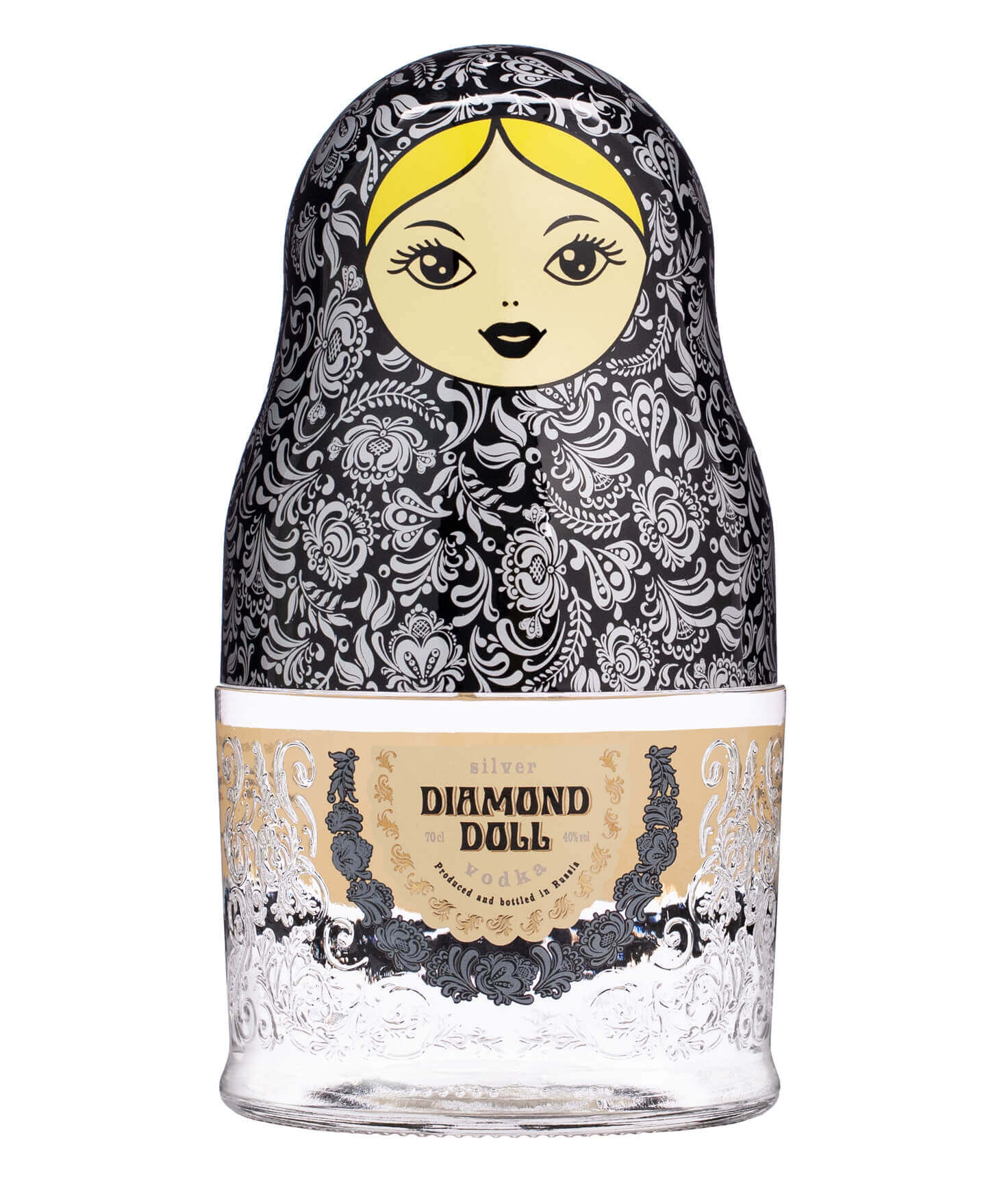 Diamond Doll Silver Vodka je pravá ruská vodka, ktorá púta pohľady svojou krásnou dizajnovou fľašou so strieborno-čiernou matrioškou a dekoratívnymi ornamentami na skle.