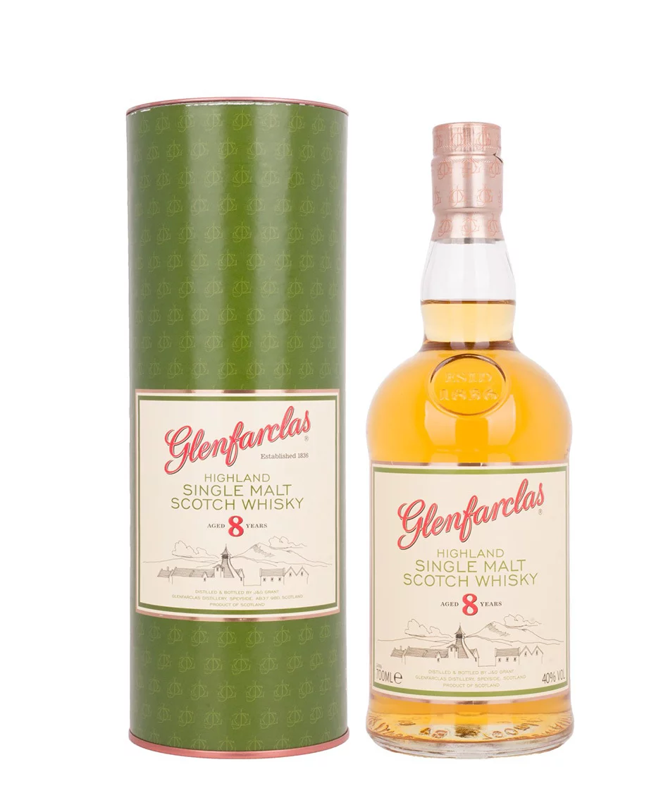 Glenfarclas 8yo je prémiová škótska single malt whisky, ktorá zrela prevažne v sudoch po sherry. Vo vôni ponúkne tóny jabĺk, medu a škorice. Výrazná chuť s nádychom orieškov a maslovosti a decentnou stopou čokolády prechádza do vanilkového záveru. Glenfarclas 8yo si vychutnáte samotný, ideálny je ako základ pre skvelé koktaily typu Manhattan.