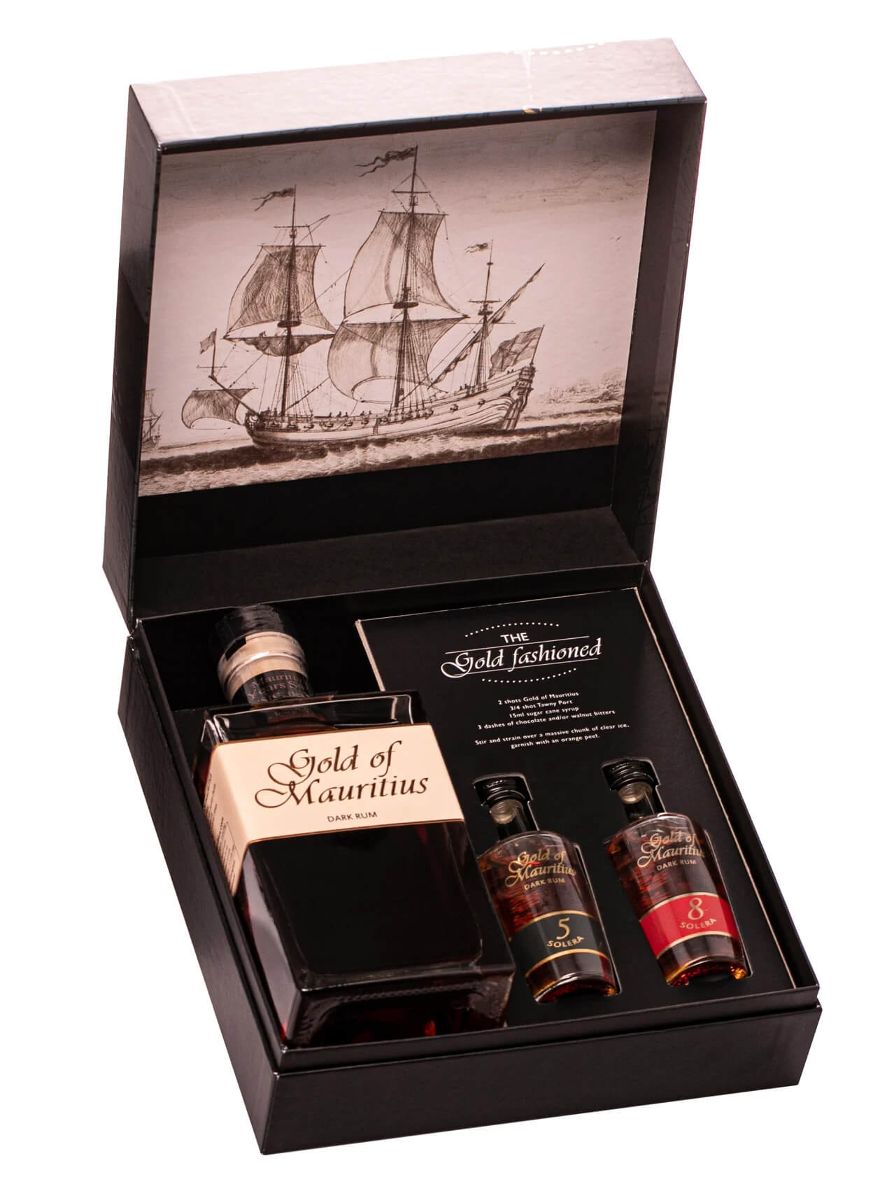 Úchvatné darčekové balenie od Gold of Mauritius obsahuje fľašu tmavého rumu Gold of Mauritius s objemom 0,7 litra a dve miniatúry. Balenie umožňuje ochutnať 0,05l tmavého rumu Solera 5 a 0,05l tmavého rumu Solera 8. Malá krajina Maurícius má dlhú tradíciu pestovania cukrovej trstiny a výroby rumu. Nápoje dozrievajú v sudoch, ktoré boli pred tým použité na výrobu vína.
