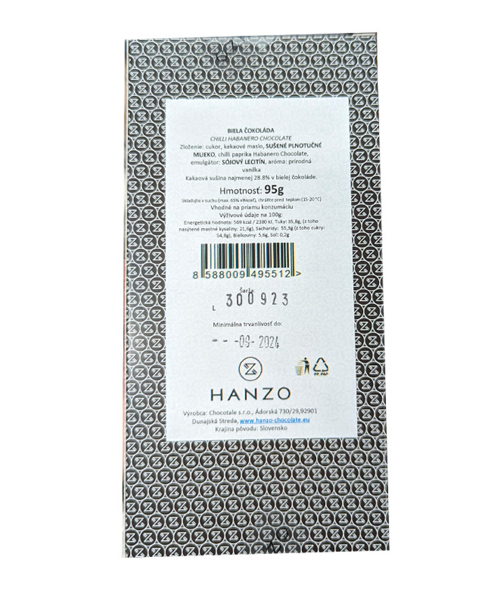 HANZO Remeselná Biela čokoláda Burning Angel chili 95g je výnimočná pochúťka pre tých, ktorí hľadajú zaujímavý zážitok spojený s pikantným dobrodružstvom. Táto remeselná biela čokoláda je obohatená o ohnivý dotyk chili, čo vytvára jedinečnú kombináciu sladko-pikantnej chuťovej palety. S každým kúskom tejto lahodnej pochúťky zažijete spojenie krémovej bielej čokolády s intenzívnym, ale vyváženým horúcim zážitkom chili papričiek.