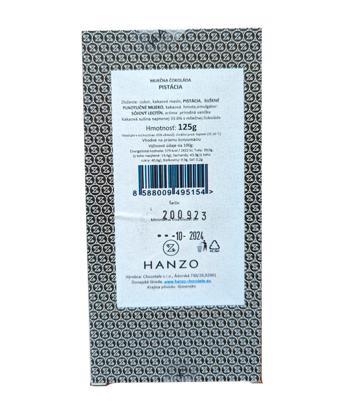 HANZO Remeselná Mliečna čokoláda s pistáciami 125g