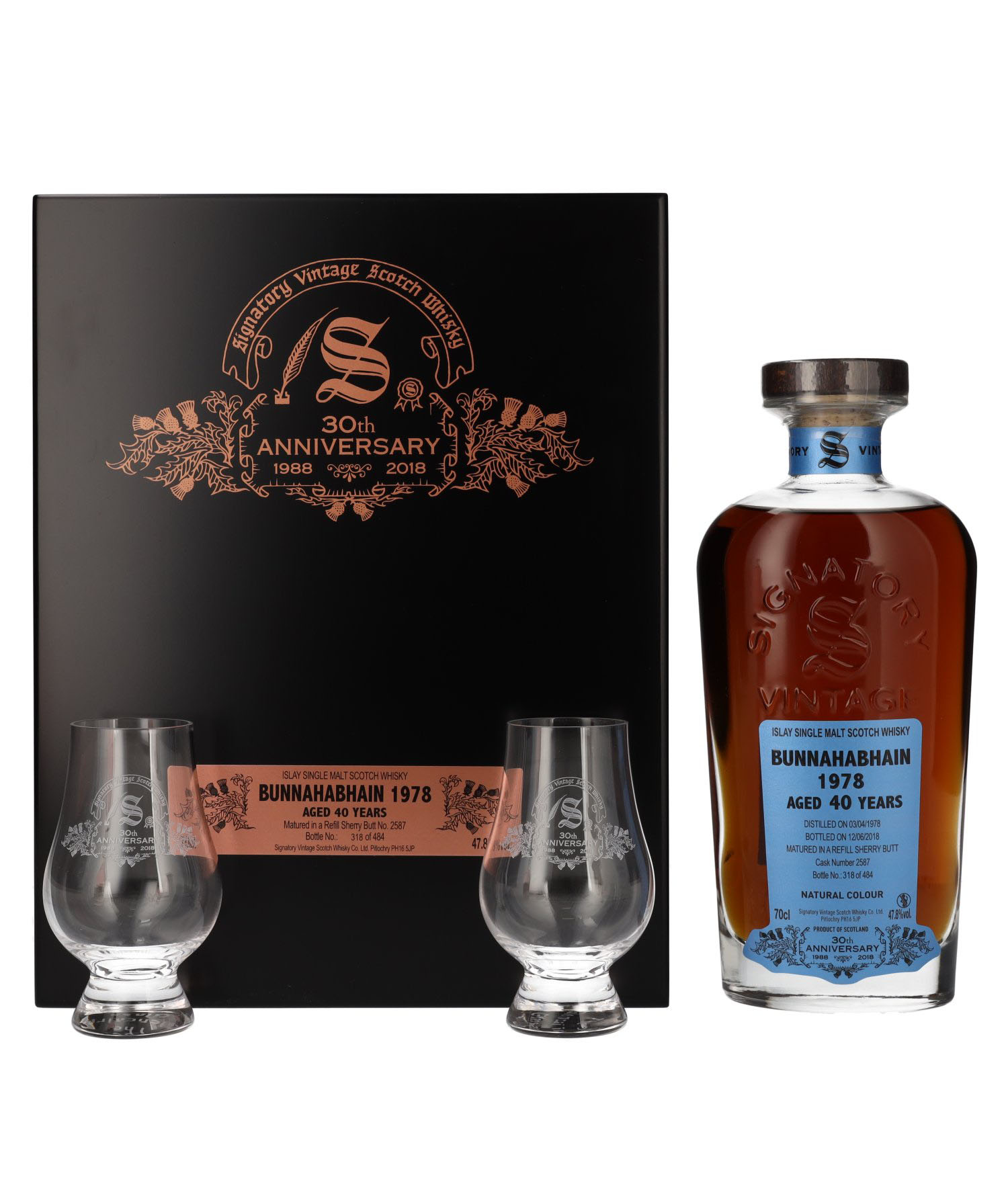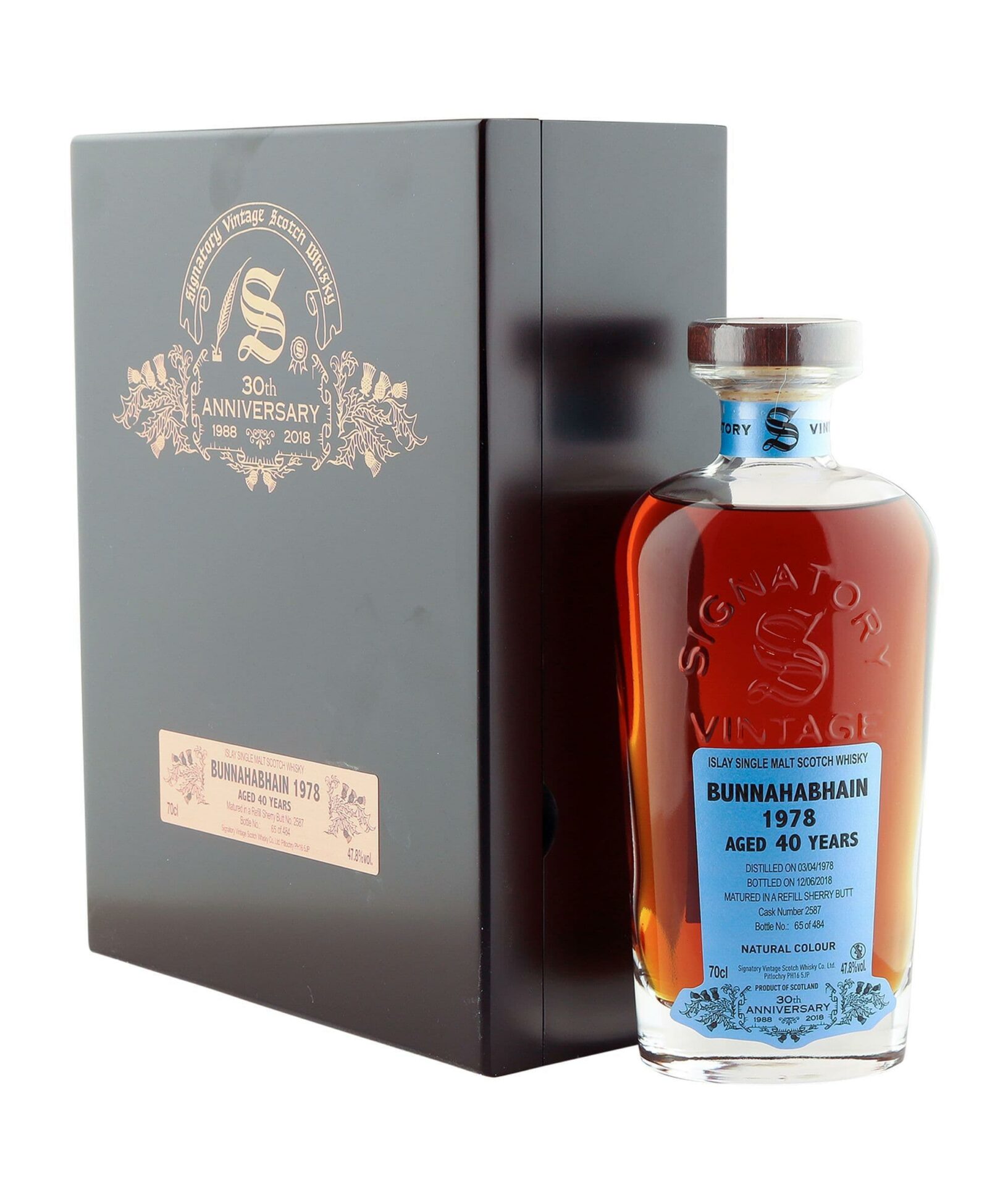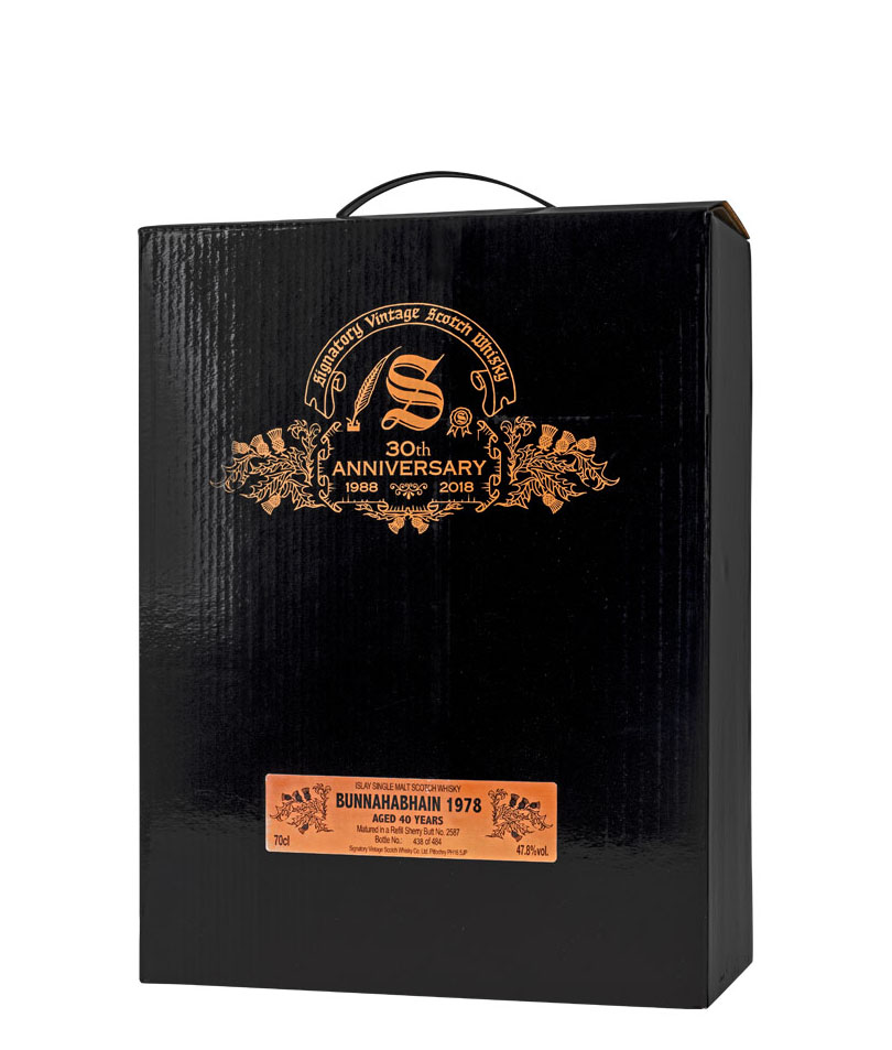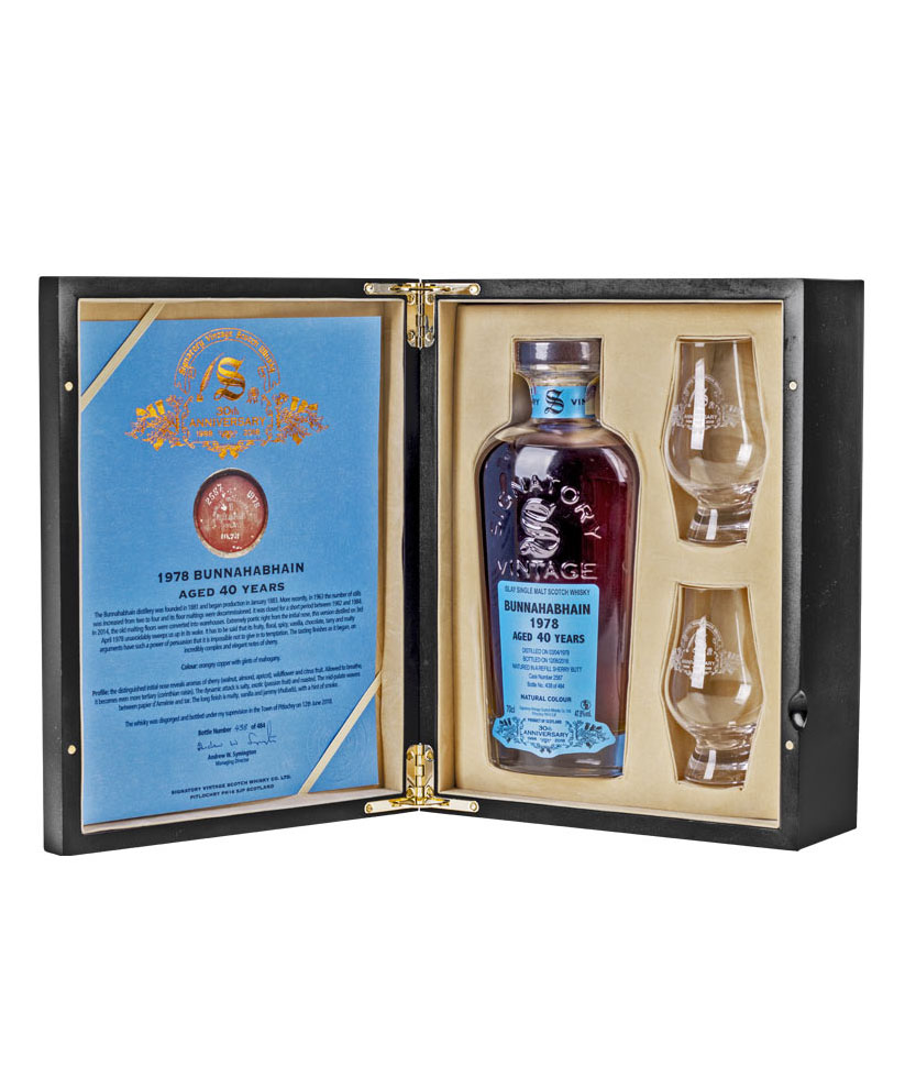 Signatory Bunnahabhain 1978 bola destilovaná 3. apríla 1978 a potom bola umiestnená do suda po sherry číslo #2587, kde zrela až 40 rokov. V júni 2018 bol sud konečne otvorený a whisky bola fľašovaná pri 47,8% alkoholu. Celkovo bolo vyrobených len 484 fliaš, takže sa jedná o veľmi limitovanú edíciu tejto výnimočnej škótskej whisky.