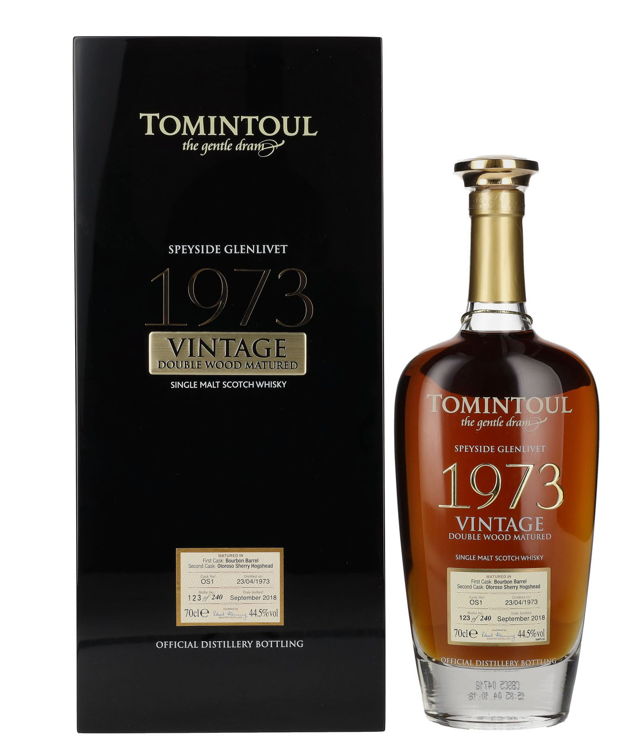 Tomintoul Vintage Double Wood zrel viac ako 30 rokov v sudoch z amerického bielého dubu, kým sa nakoniec nedozrie v sudoch po sherry Oloroso. Destilovaný: 23. apríla 1973. Naplnený do fľaše: september 2018. Limitované na 240 fliaš po celom svete! Poznámky k ochutnávke: Farba: zlatá. Vôňa: Jasne cítiť vôňu sherry, sladkú, sladovú, intenzívnu, pomaranče, citrusy a vianočný puding. Chuť: Plná, korenistá, dubová, orechová, čokoláda, kávové zrno a taníny. Záver: Dlhý, pikantný a suchý.